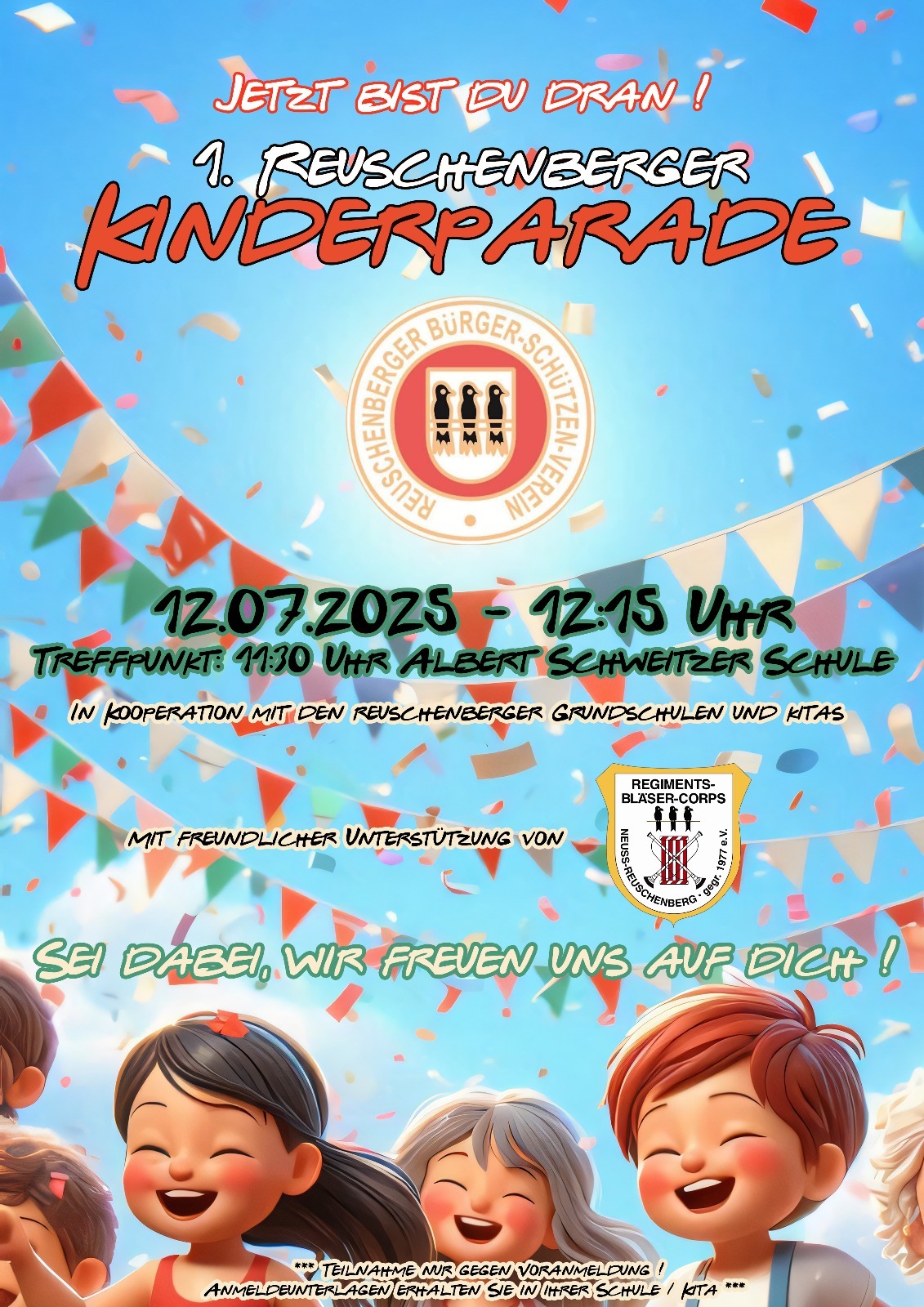 1. Reuschenberger Kinderparade03.04.2025 Am 12. Juli 2025 findet die 1. Reuschenberger Kinderparade statt! Kinderparade 20251. Reuschenberger Kinderparade zurück zu Aktuelles